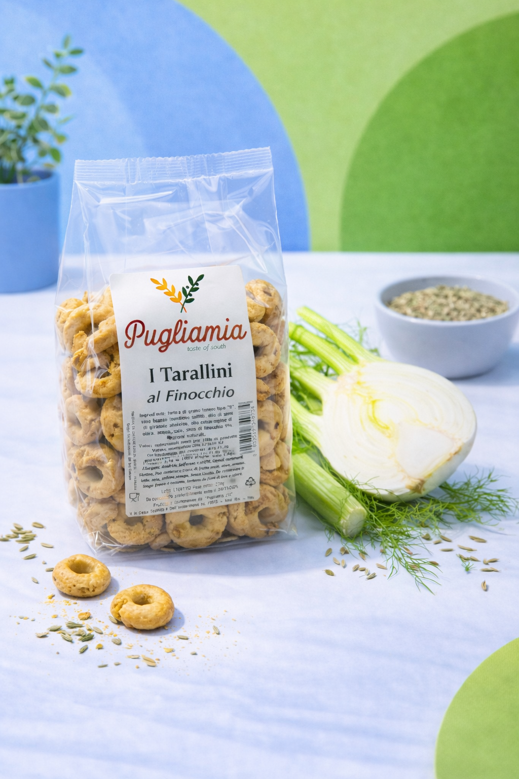 I taralli al finocchio, la friabilità e il loro attraente colore dorato sono le principali caratteristiche che rendono il prodotto originale ed esclusivo.